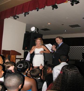 | Stacey Noles with a student playing "Trivia" at a middle school prom |
